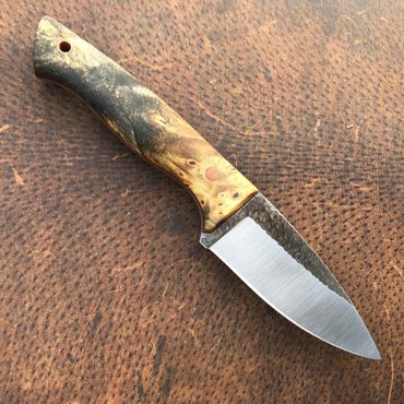 The Apache was designed to be a field and game knife. Inspired by Native American blade shapes and named after the US Army attack helicopter. Its dropped point leaf shaped blade lends to a accute tip useful for precice cuts wtihout sacrificing strength. It has an overall length of 8 3/4" with a 4 1/4 blade.