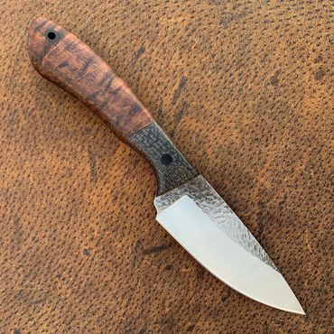 The Belt Knife #1 has dropped point blade with a guardless ricasso. The open feeling handle allows freedom of movement. The flat first half of the handle allows for a secure grip without rolling in the hand. Its has scallop in the front handle for indexing. With an overall length of 8 3/4" with a 4 1/8" blade.