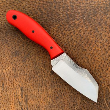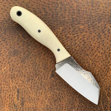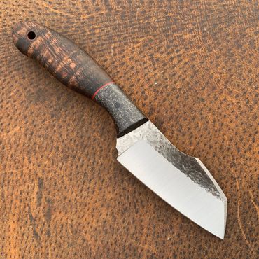 The Gremlin is a compact everyday carry knife. It has an open feeling handle that allows it to be comfortably handled even with larger hands. The guardless ricasso coupled with an upswept handle allows it to be useful as a traveling food prep knife also. It has an overall length of 6 1/2" with a 3" blade.